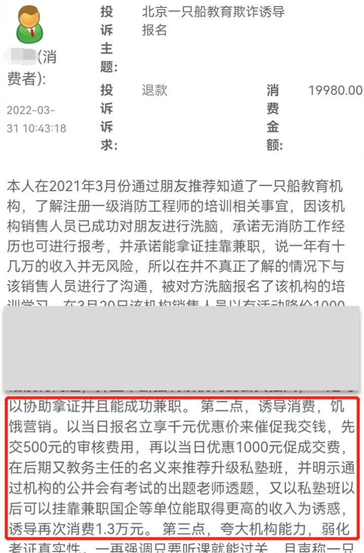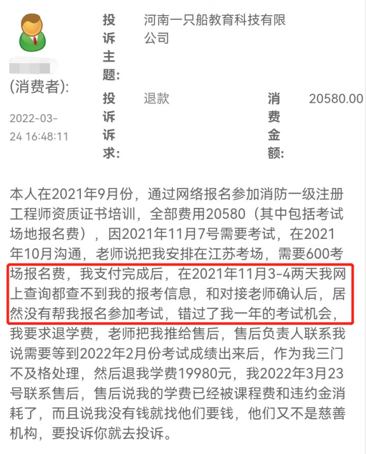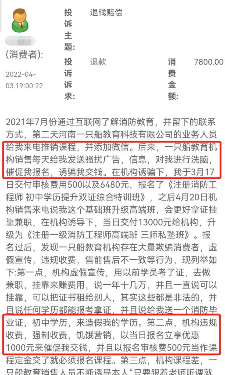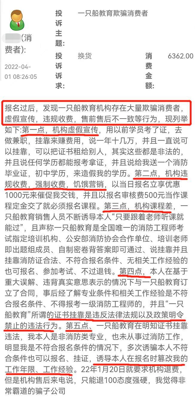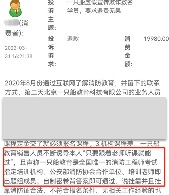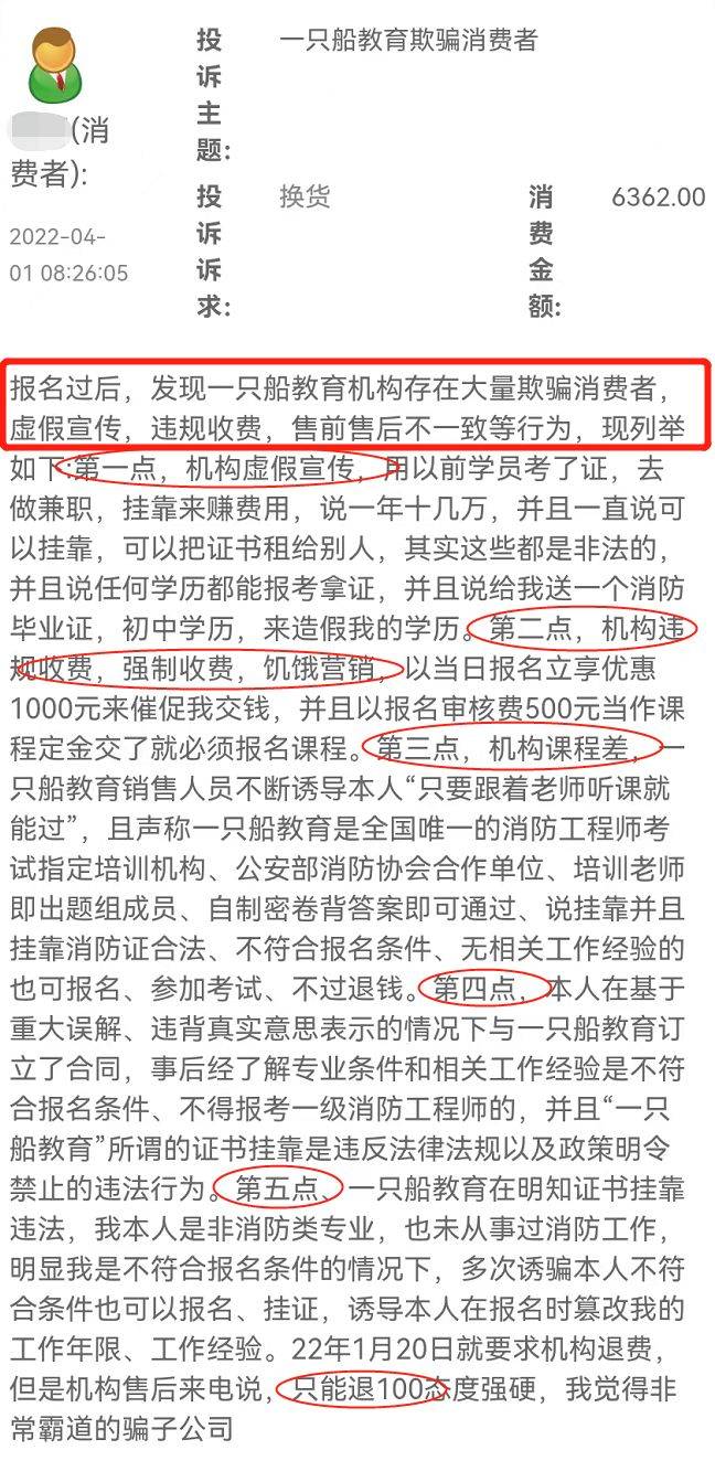 投诉通平台投诉案例显示,某些注册消防工程师培训机构以挂靠费和执业费为噱头,采用虚假宣传、持续诱导等方式吸引学员缴纳高额学费,再通过一系列霸王条款拒绝退款,给学员造成很大损失。一只船教育、天普教育、哲翰教育、嗨学网等均在被投诉之列,其中一只船教育被投诉最多,仅3月份以来就被投诉25例。