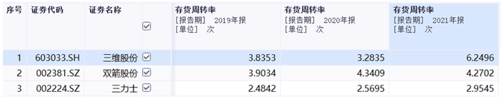 招股书中列举的三维股份、双箭股份、三力士3家同行业上市公司,在与同行应收账款周转率、存货周转率情况对比分析时,招股书选取的其他三家同行数据与同花顺提供的上市公司数据均存在不同程度上的差异。