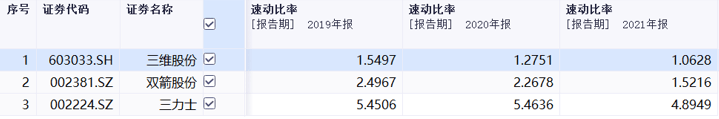 元创股份招股书显示,报告期各期,三维股份的速动比率分别为1.63、1.43、1.12;双箭股份的速动比率分别为2.55、2.32、1.56;三力士的速动比率分别为5.67、5.71、5.06;三者均值分别为3.28、3.15、2.58。