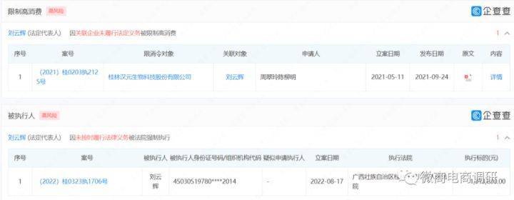 据企查查显示,在过往这些年间,刘云辉还曾因关联企业(桂林汉元生物科技股份有限公司,刘云辉为该公司董事长)未履行法定义务被法院出示了限制消费令。到了2022年8月,此人又因未按时履行法律义务被广西壮族自治区桂林市灵川县人民法院强制执行,执行标的达到1013800元。