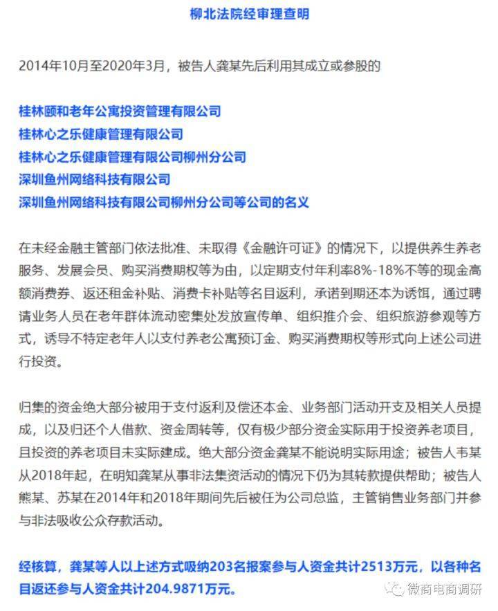 值得注意的是,截至目前,刘云辉还一直担任着桂林颐和老年公寓投资管理有限公司的小股东,而该公司曾牵涉到一场非法吸收公众存款案中。2022年6月24日,柳北法院通过远程庭审集中宣判两起(同一犯罪事实)以投资养老项目获得高额回报为噱头的涉养老诈骗案件,共计203名老人报案,涉案金额高达2513万元。该案系全国开展打击整治养老诈骗专项行动以来,柳北法院受理并宣判的首批涉养老诈骗犯罪案件。根据相关报道显示,桂林颐和老年公寓投资管理有限公司在本案中也扮演着重要角色。