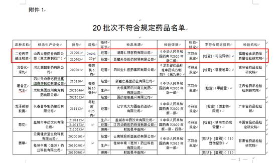 通告显示,经福建省食品药品质量检验研究院检验,标示为山西太原药业有限公司(原太原制药厂)生产的2批次二羟丙茶碱注射液不符合规定,不符合规定项目为可见异物。