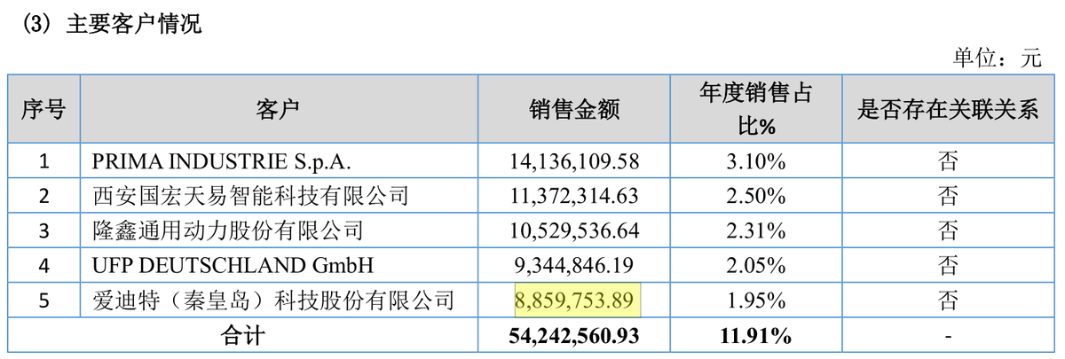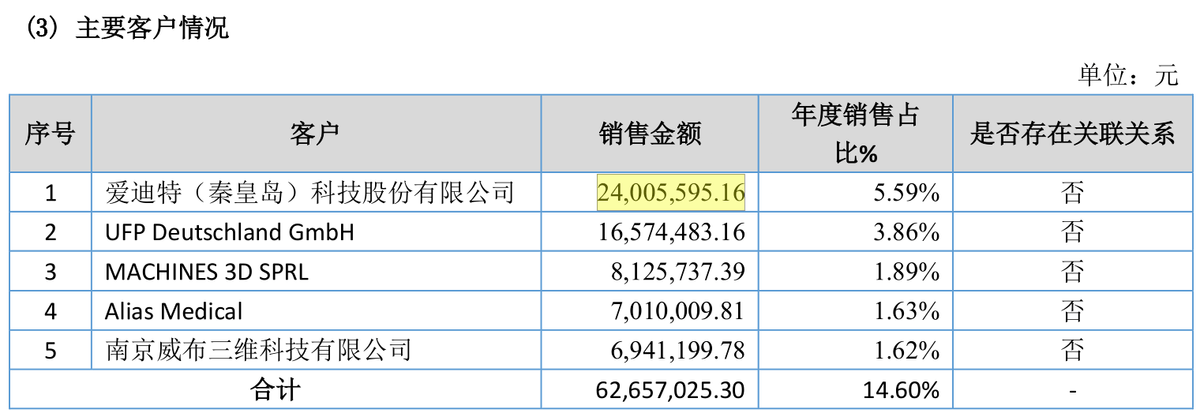 先临三维2021年不具名披露向前五大客户的销售情况,其中先临三维向第一大客户销售金额为3,287.18万元,该数据仍少于爱迪特披露的向其采购金额。