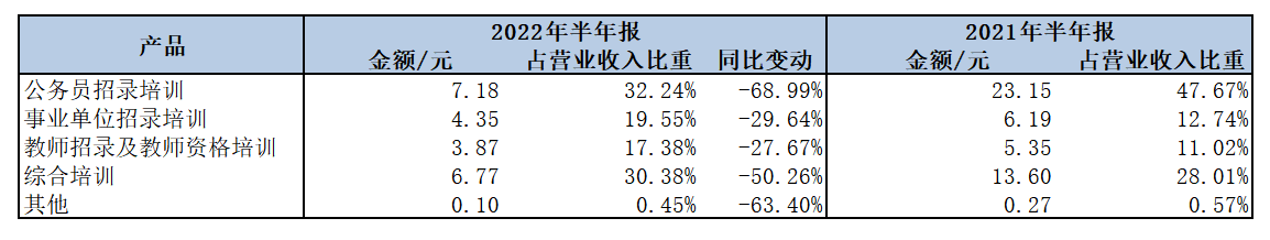 分产品来看,上半年公务员招录培训实现营业收入7.18亿元,同比减少68.99%;事业单位招录培训实现营业收入4.35亿元,同比减少29.64%;教师招录及教师资格培训实现营业收入3.87亿元,同比减少27.67%;综合培训实现营业收入6.77亿元,同比减少50.26%。
