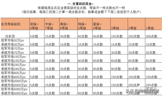 三、对应的奖金。1. 安置组织奖金:公司每周会依据会员冠军市场和卓越市场的业绩奖励对应点数,1点数约35元,依据汇率差会在35元上下浮动。