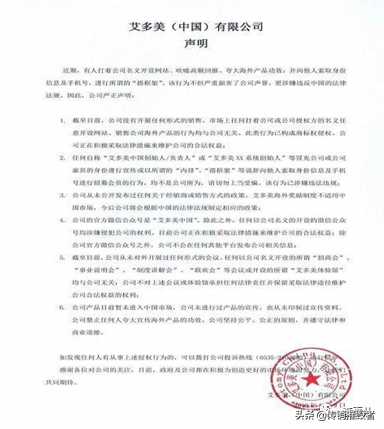 与经销商疯狂拉人头注册不同,艾多美官方2018年、2019年曾发布公告,对市面上各种形式的以艾多美名义经营的行为予以否定。否认存在“招商会”、“事业说明会”等会销活动,认为那些以“艾多美中国创始人/合伙人”身份招商的人涉嫌违法违规,艾多美将保留采取法律途径维权的权利。