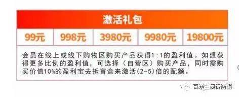 激活礼包一共五个级别,分别为:99、998 、3980、9980、19800,在代理专区购买商品后,会获得同1:1的“盈利值”(盈利值即消费所产生的积分)。