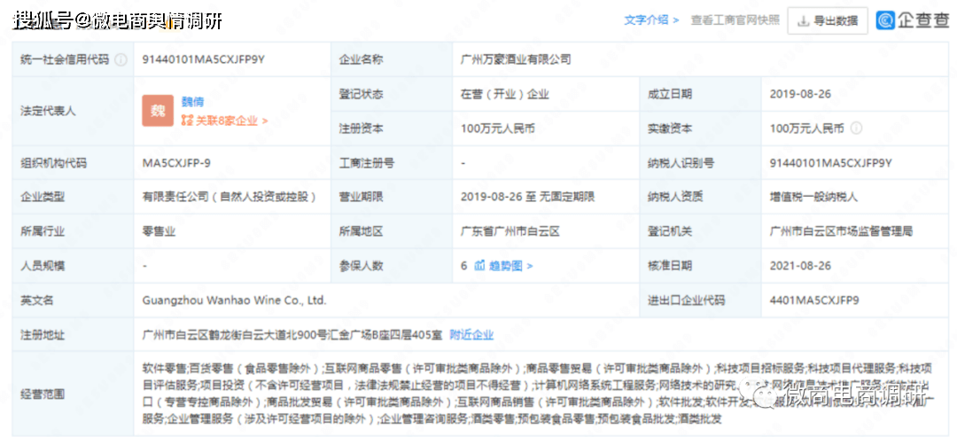 企查查APP显示,广州万豪酒业有限公司成立于2019年8月26日,企业地址位于广州市白云区鹤龙街白云大道北900号汇金广场B座四层405室,注册资本为100万元,实缴资本为100万元,法定代表人为魏倩。该公司由施晓燕控股60%,魏倩控股40%并担任执行董事兼总经理,索凤超担任监事。