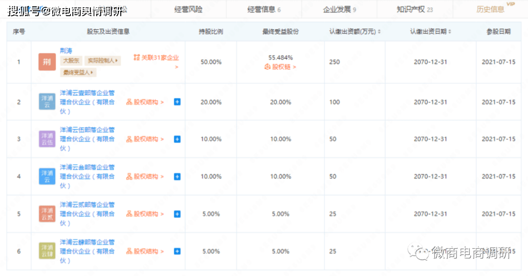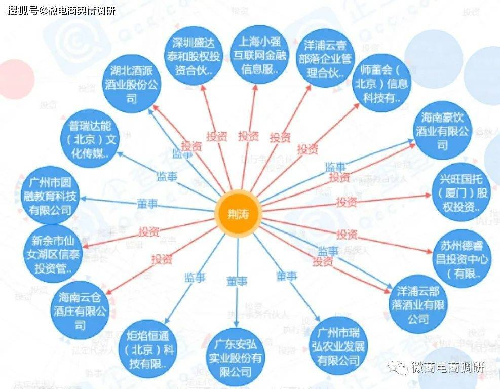 企查查APP显示,荆涛共与31家企业有关联。他担任了未来派实业有限公司、上海卓爵教育科技中心、重庆迪莱企业管理咨询部和上海诺可化妆品有限公司4家企业的法定代表人;投资了兴旺国托(厦门)股权投资合伙企业(有限合伙)、苏州德睿昌投资中心(有限合伙)、海南云仓酒庄有限公司、新余市仙女湖区信泰投资管理中心(有限合伙)、上海小强互联网金融信息服务有限公司、湖北酒派酒业股份公司等23家企业;在炬焰恒通(北京)科技有限公司、普瑞达能(北京)文化传媒有限公司、武汉未来派食品有限公司等18家企业均有任职。