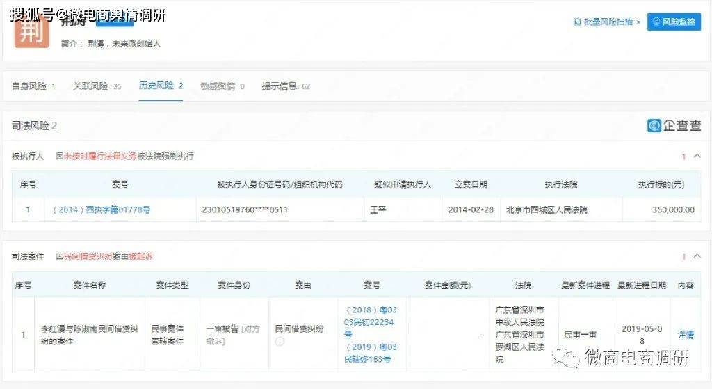 值得注意的是,这些企业中,有6家公司已是注销状态,还有7家公司已被吊销,而荆涛本人还曾因民间借贷纠纷案由被起诉1次,因未按时履行法律义务被法院强制执行1次。