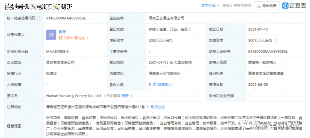 雷盛红酒的经营销售企业海南云仓酒庄有限公司成立于2021年7月15日,企业地址位于海南省三亚市崖州区崖州湾科技城百泰产业园四号楼六层622室9号,注册资本为500万元,实缴资本为500万元,法定代表人为荆芳。该公司由荆涛控股50%,洋浦云壹部落企业管理合伙企业(有限合伙)持股20%,洋浦云伍部落企业管理合伙企业(有限合伙)持股10%,洋浦云叁部落企业管理合伙企业(有限合伙)持股10%,洋浦云贰部落企业管理合伙企业(有限合伙)持股5%,洋浦云肆部落企业管理合伙企业(有限合伙)持股5%,荆芳担任该公司执行董事兼总经理,熊耀文担任监事。荆涛是该公司的实际控制人和最终受益人,同时也是云仓酒庄的创始人。