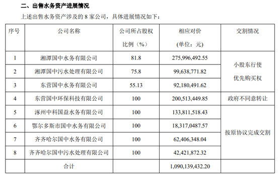截至此次公告,出售的8项资产中,涿州中科国益水务、鄂尔多斯国中水务、齐齐哈尔国中水务、齐齐哈尔国中污水4家公司已完成交割;但因政府不同意转让,东营国中环保科技未与碧莱投资办理交割手续;而东营国中水务,则因小股东东营自来水公司行使优先购买权,已于2018年10月交割完毕。