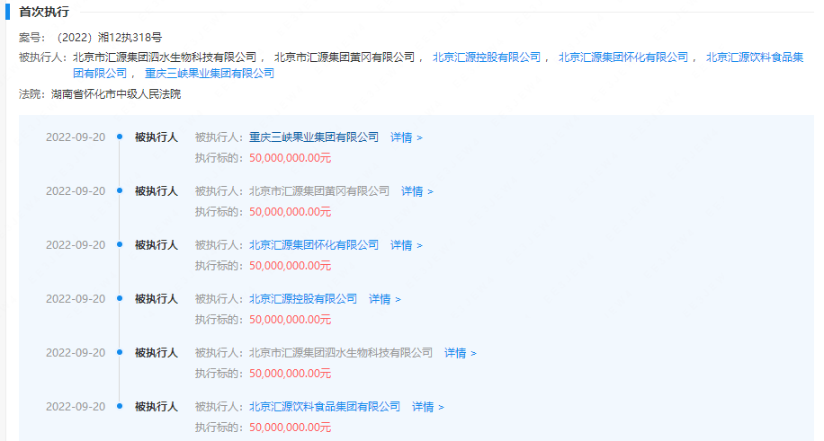 汇源大股东再被执行5000万元,被执行总金额超26亿