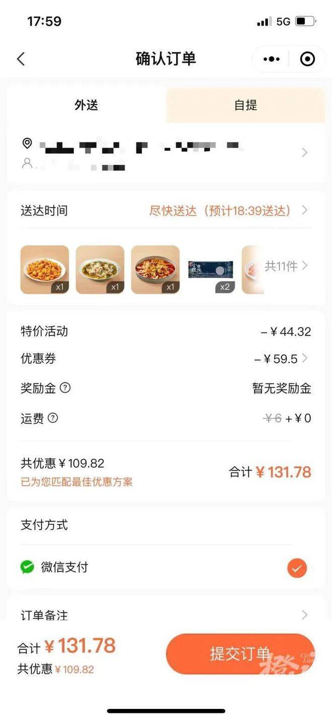 在小倩的门店里,我用舌尖英雄的微信小程序,下单了酸菜鱼、小酥肉、宫保鸡丁等11种菜品,在减去特价活动优惠的44.32元,再用掉新人59.5元的优惠券后,最后我付了131.78元。也就是说,我以每单不到12元的价格,就买下了饭店一盘价格一般在40多元的酸菜鱼。