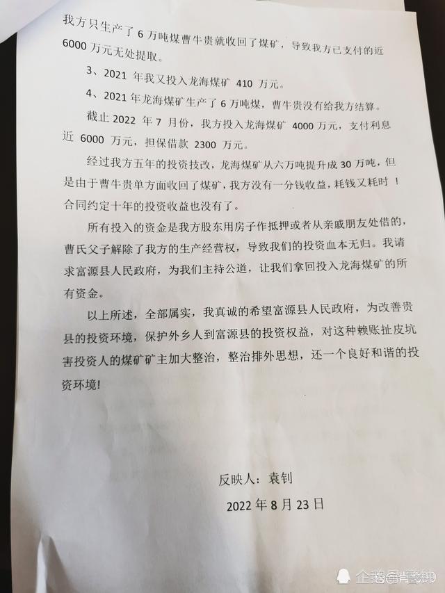 2017年, 龙海煤矿引进了托管方陕西商人袁某,对煤矿进行垫资升级改造、扩能建设,总投资达4000多万元,另外投资方还帮业主方引荐资方,并为业主方提供担保的借款2300万元。彼时,急需资金的龙海煤矿对陕西商人重视有加,但随着历时5年的技改工程竣工验收,煤矿方开始毁约强行将投资方人员撵出,违约剥夺了投资方及劳务方的管理权限。不但不让参与生产管理,也不给投资方算账,致使投资方损失高达近亿元,还有预期十年的经营收益也无法实现。