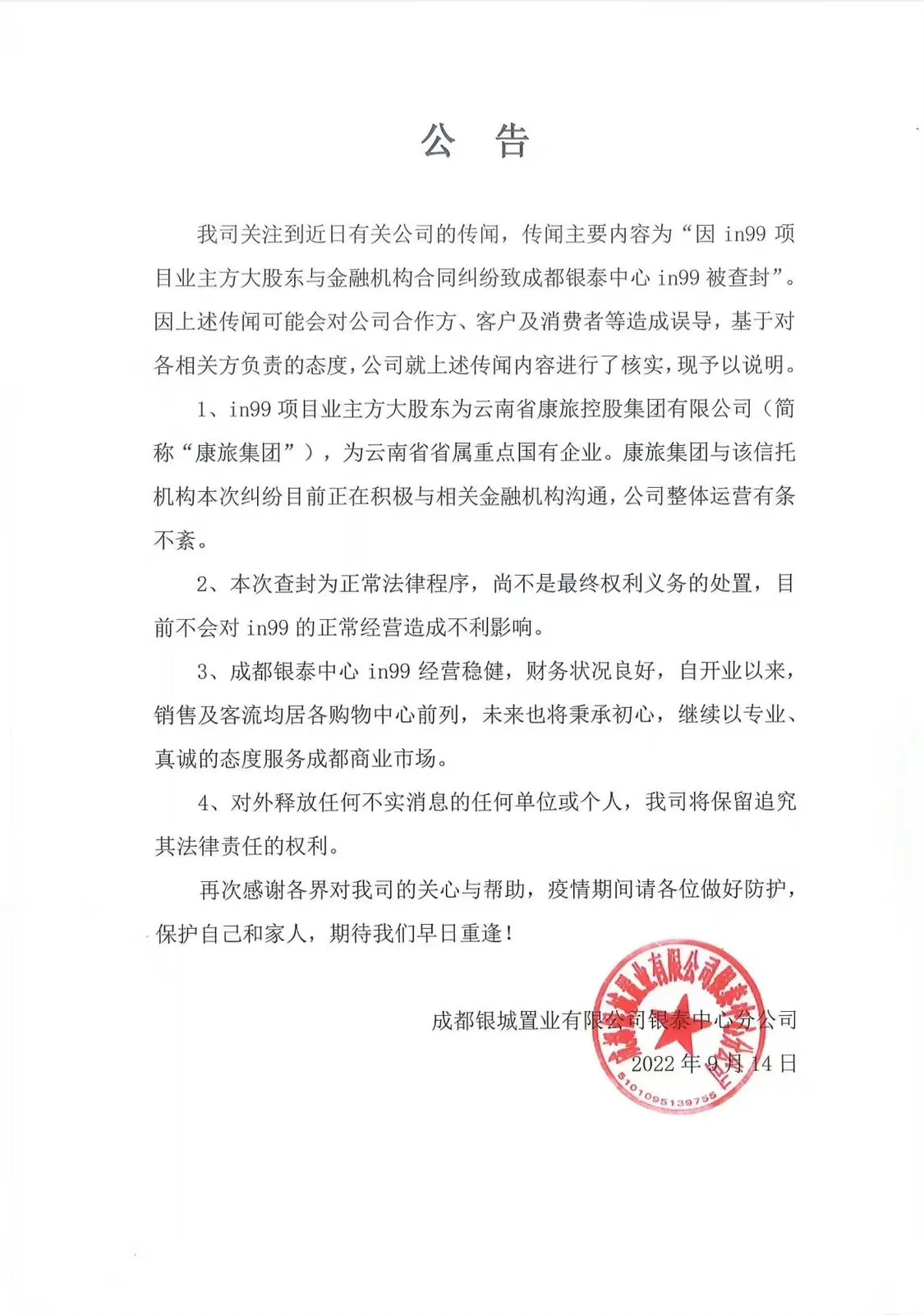 9月14日下午,银泰in99购物中心所属公司成都银城置业有限公司银泰中心分公司发布公告称:“本次查封为正常法律程序,尚不是最终权利义务的处置,目前不会对in99的正常经营造成不利影响。”公告同时还提到,in99经营稳健,财务状况良好,自开业以来,销售及客流均居各购物中心前列,未来也将秉承初心,继续以专业、真诚的态度服务成都商业市场。
