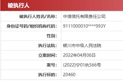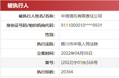 日前,中国执行信息公开网显示,中信信托有限责任公司(下称“中信信托”)产生两则被执行信息,执行标的共40824元,执行法院均为银川市中级人民法院。