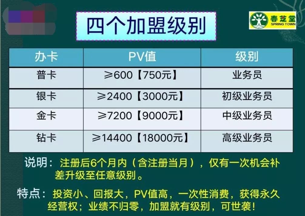 具体来看,普卡交纳加盟费750元+10200元大礼包(春芝堂产品“中华三宝”),合计金额10950元,级别为业务员。银卡交纳加盟费3000元+10200元大礼包,合计金额13200元,级别为初级业务员。金卡交纳加盟费9000元+10200元大礼包,合计金额19200元,级别为中级业务员。钻卡交纳加盟费18000元+10200元大礼包,合计金额28200元,级别为高级业务员。