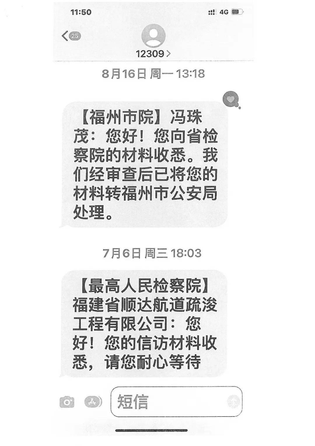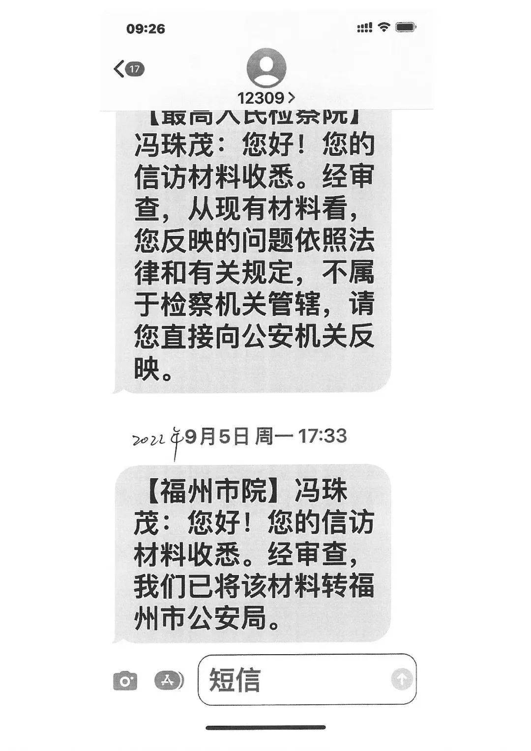 2021年8月16日、2022年9月5日,冯珠茂向最高人民检察院举报的材料经层层转办后,福州市人民检察院向其作出回复:经审查,我们已将该材料转福州市公安局。