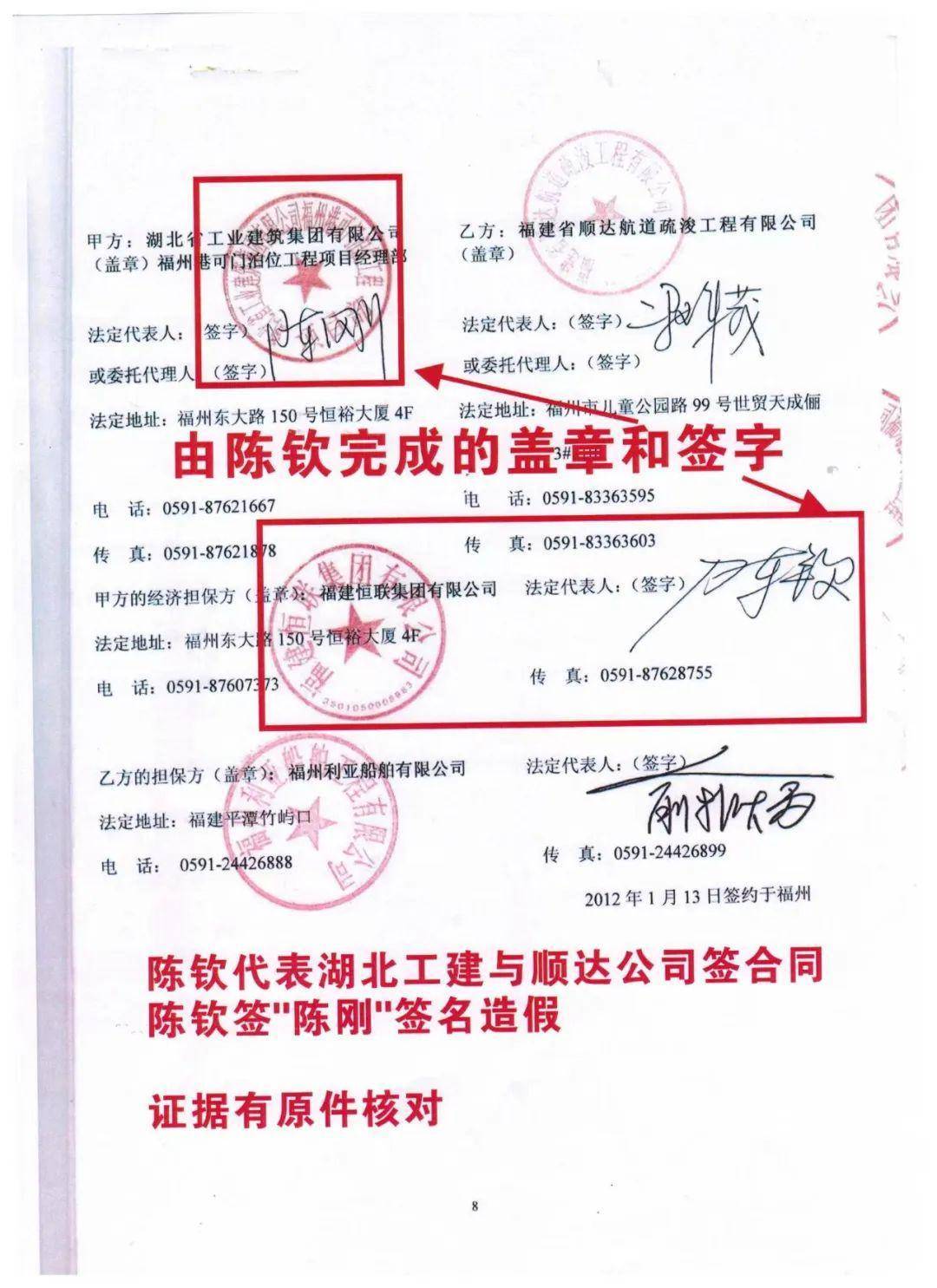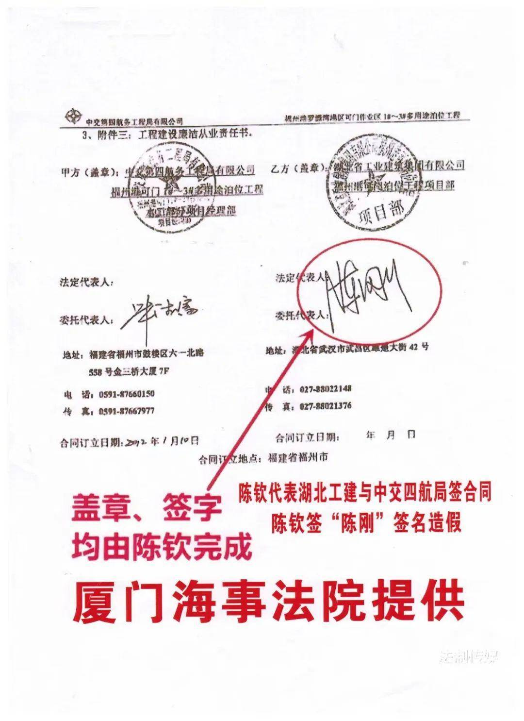 冯珠茂称,尽管顺达公司的合同相对方是湖北工建,但在订立合同乃至整个磋商谈判的过程中,湖北工建却从未出现过,始终由陈钦代表湖北工建与顺达公司谈判签约,就连合同上“陈刚”字样的签名,也都是由陈钦代签,“湖北工建福州港可门泊位工程项目经理部”字样的公章也是由陈钦所盖。