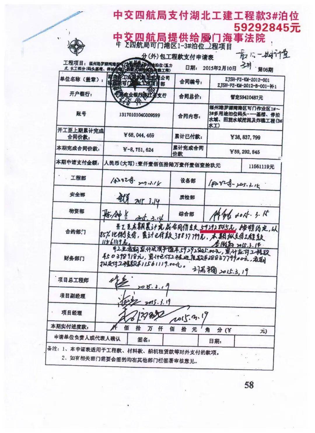 例如,湖北工建总共向顺达公司支付工程款1.15亿余元,但仅凭顺达公司完成的同一工程量,湖北工建居然向总包单位中交四航局申请工程款近2.85亿元。其中1#-2#泊位码头为2.25亿余元,3#泊位码头5929万余元,虚报工程款高达1.7亿元。