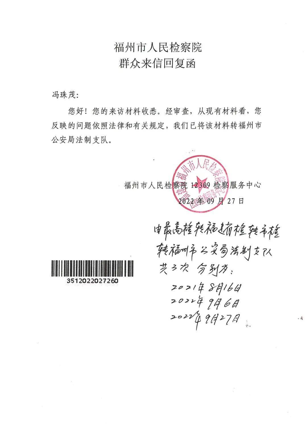 2022年9月27日,福州市人民检察院12309检察服务中心向冯珠茂作出《群众来信回复函》称,已将材料转福州市公安局法制支队。