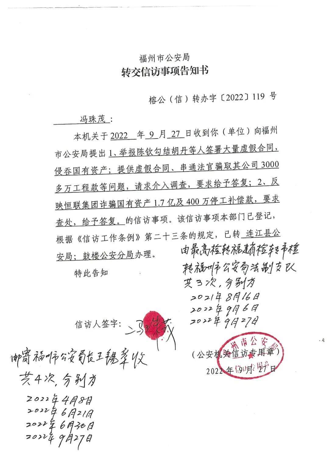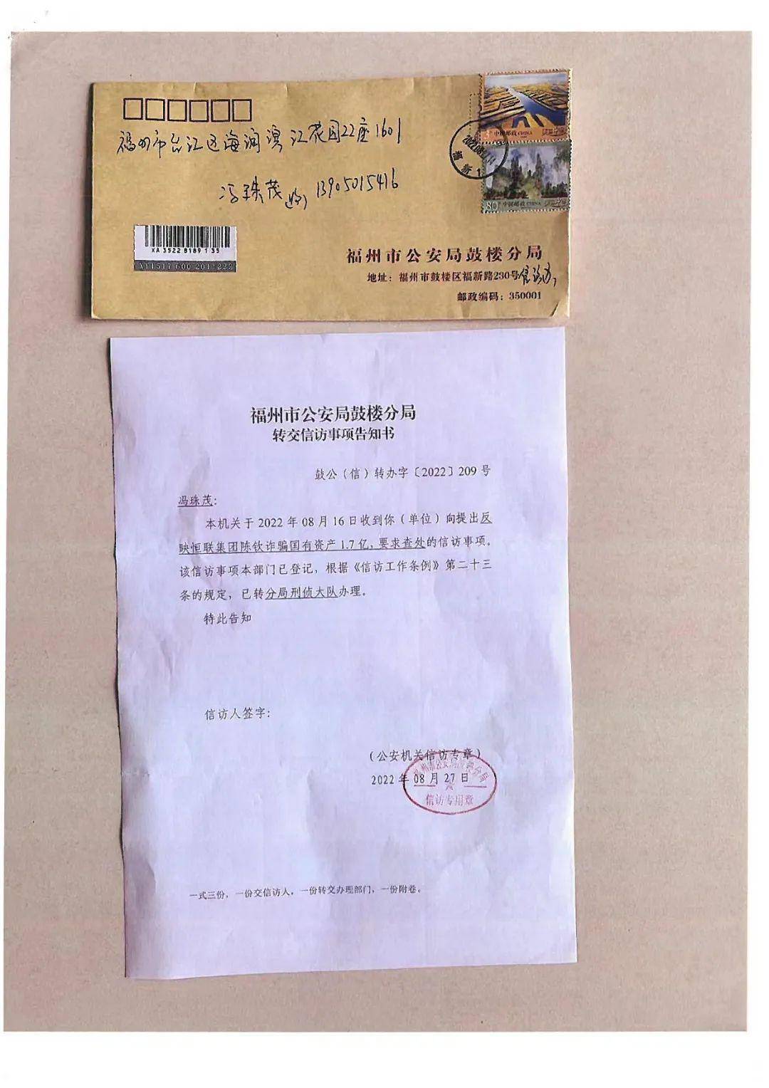 2022年8月27日,福州市公安局鼓楼分局向冯珠茂作出《转交信访事项告知书》称,该材料已转分局刑侦大队办理。