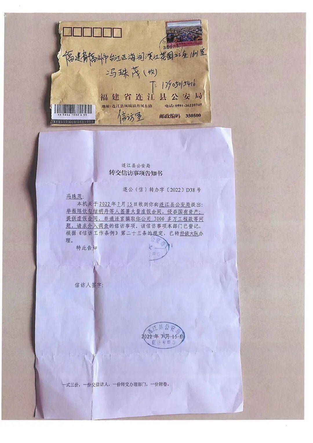 2022年7月15日,连江县公安局向冯珠茂作出《转交信访事项告知书》称,该局已将材料转经侦大队办理。