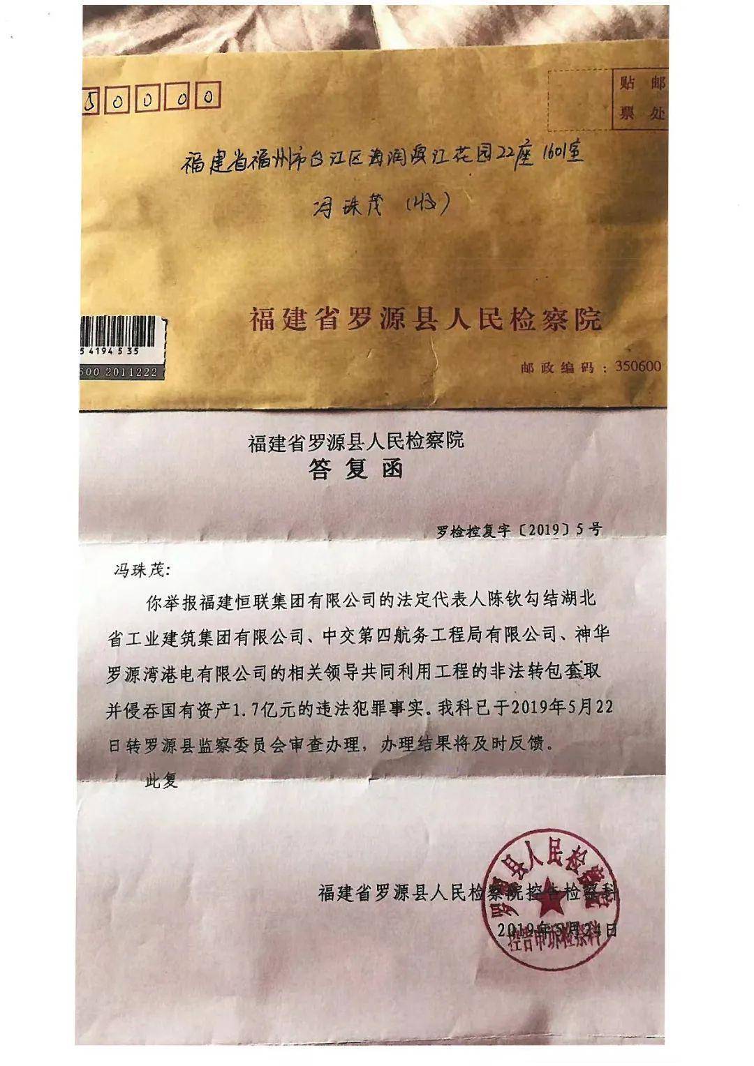 比如,2019年5月24日,福建省罗源县人民检察院控告申诉检察科向冯珠茂作出答复:你举报福建恒联集团法定代表人陈钦勾结湖北工建、中交四航局、神华港电的相关领导共同利用工程非法转包套取并侵吞国有资金1.7亿元的违法犯罪事实,我科已于2019年5月22日转罗源县监察委员会审查办理,办理结果将及时反馈。