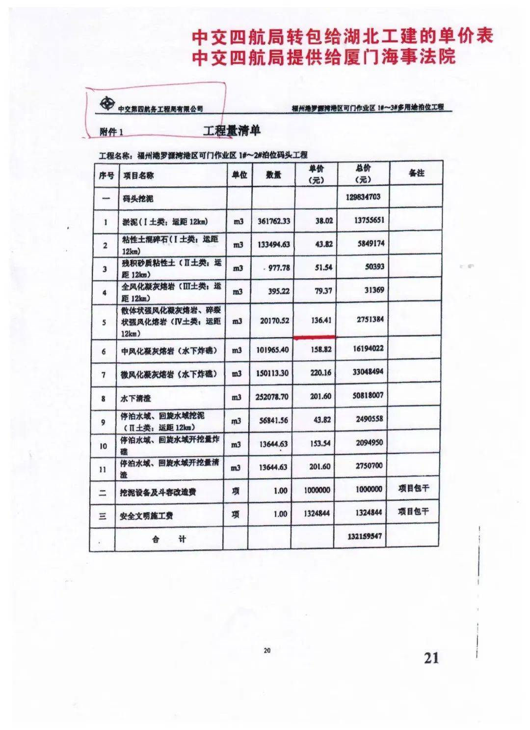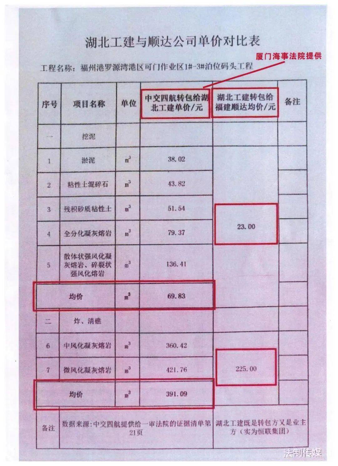 证据表明,在挖、运泥和炸、清礁项目方面,湖北工建虚报工程单价十分明显。例如,湖北工建转包给顺达公司的挖、运泥综合单价每立方只有23元,但其与总包单位结算时每立方却高达69.83元,比实际单价高出了三倍;湖北工建转包给顺达公司的炸、清礁综合单价每立方225元,而其与总包单位结算时每立方却高达391.1元。