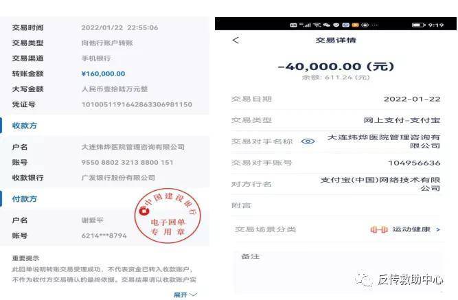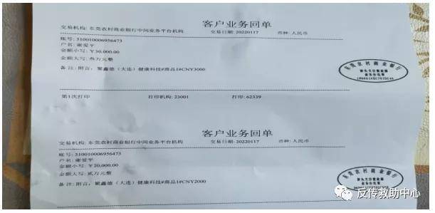 此次会议,德元升公司通过包装的背景及实力吸引了很多新人参会,1月22日晚上,刘某迪、何某密和广州寇姐要求谢女士支付开医馆的余款,当时谢女士找朋友借16万元才凑齐20万,分别打给了大连炜烨医院管理咨询有限公司16万,支付宝刷款4万聚鑫德(大连)健康科技有限公司。
