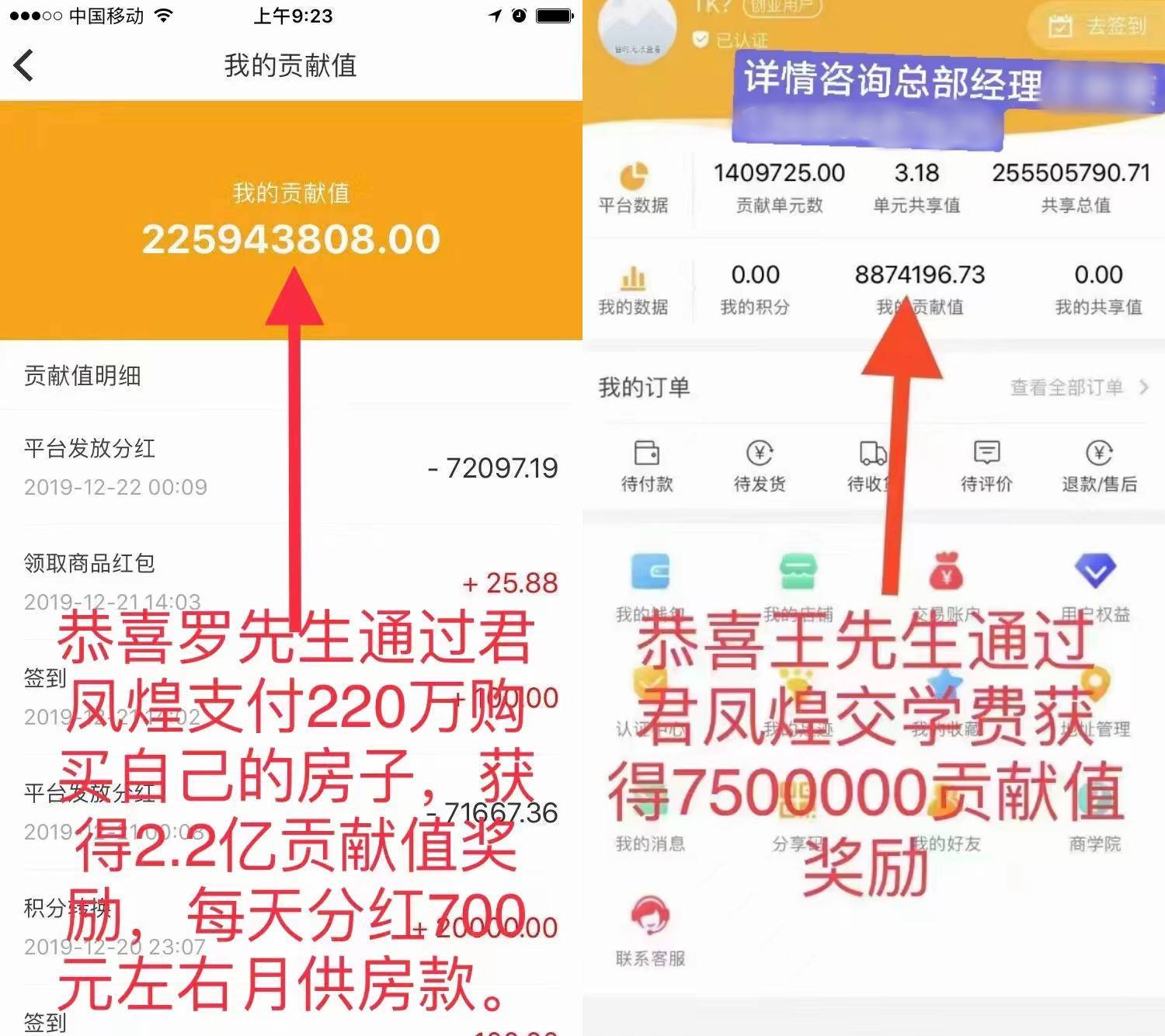 近日,李旭反传防骗团队接到多位网友反馈,家人参与了一个名为“君凤煌”的电商平台,该平台宣传群众注册成为会员后,所消费金额可以变成贡献值,贡献值可参与每日分红,最终消费的钱都将通过分红返还回来。贡献值越高,分红就越多,除了消费获得贡献值,发展他人加入、每日签到、看视频广告等都可获得贡献值。