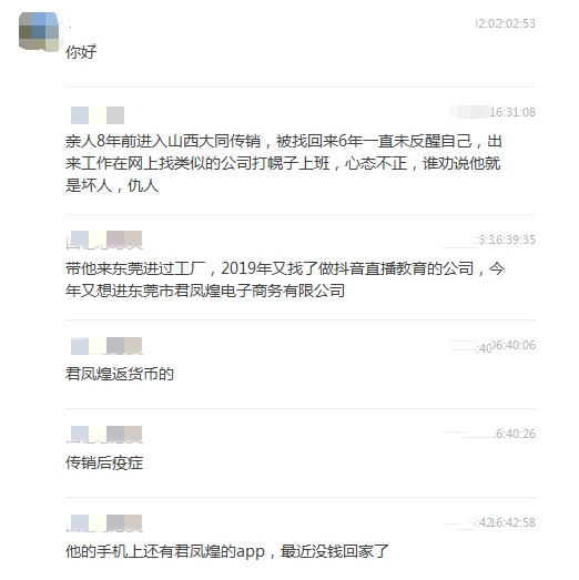 “今年上半年,他又听朋友忽悠,想进东莞市君凤煌商务有限公司,说是消费返利、可以参与分红。”小王说到,前段时间小王的家人因为没钱回家了,但是对这份所谓的“事业”还是信以为真。