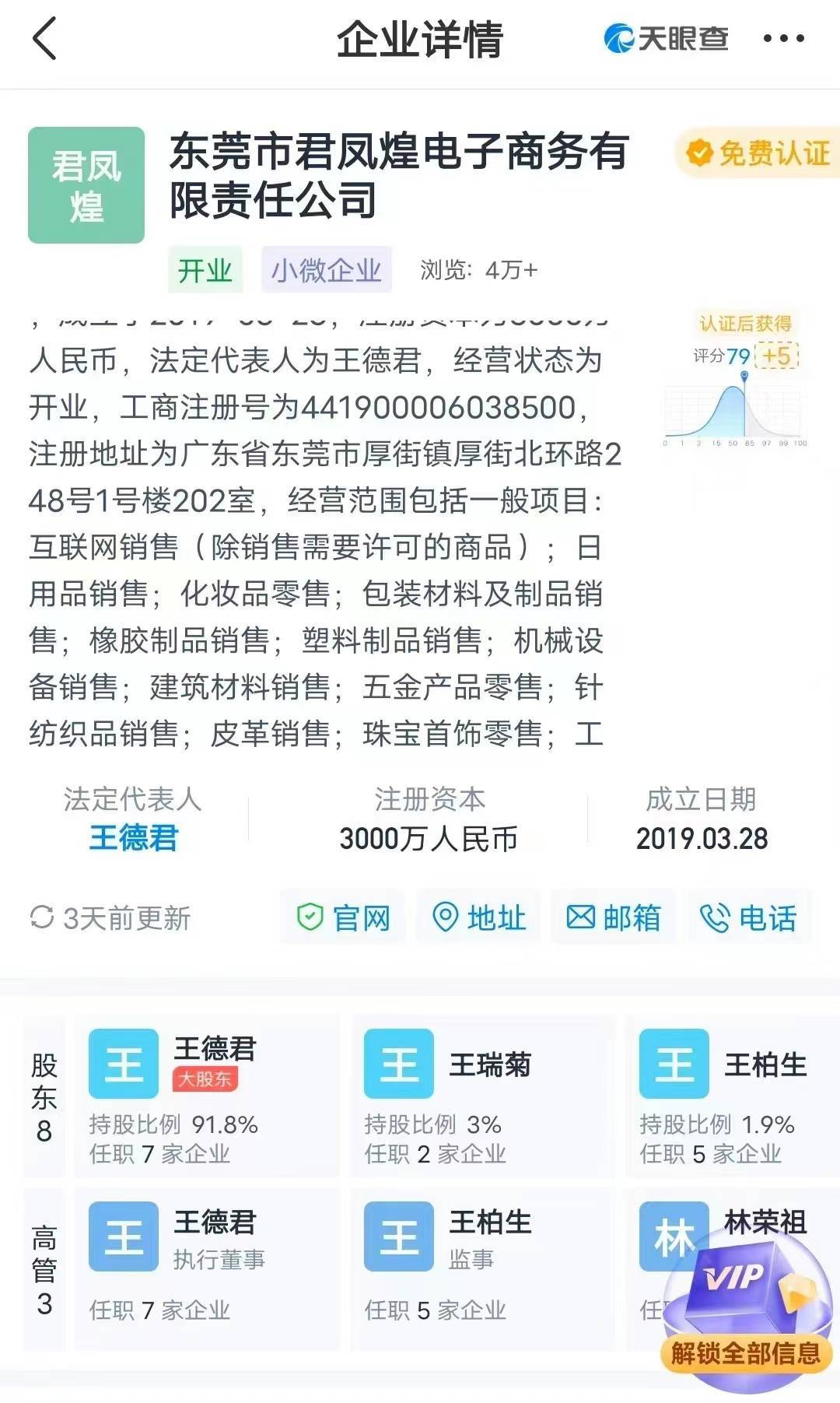 君凤煌官方资料显示,东莞市君凤煌电子商务有限责任公司是一家创新型、分享经济、消费、创业为一体的第三方电子商务线上线下共享平台。于2019年3月28日注册成立,法人为王德君,注册资本3000万元。