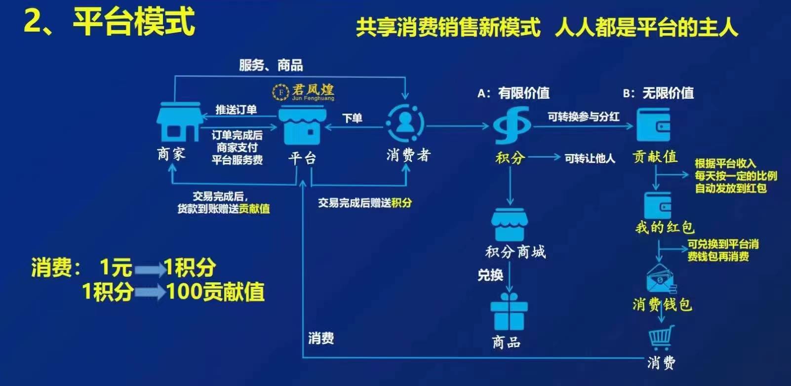 上述会员对李旭反传防骗团队介绍:其返还规则为消费1元等于1积分,1积分等于100贡献值。假设某消费者在该平台消费100元,这100元将会以10000个贡献值的形式存在。君凤煌再以每天3.03的分红系数进行计算返还。直至返还完。