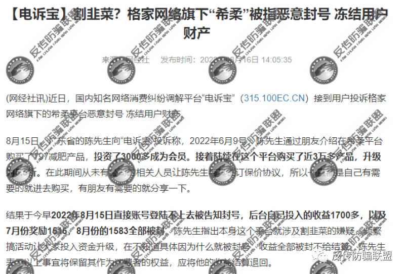 值得一提的有,就在前几日,由网经社发文指出“割韭菜?格家网络旗下希柔被指恶意封号,冻结用户财产”。