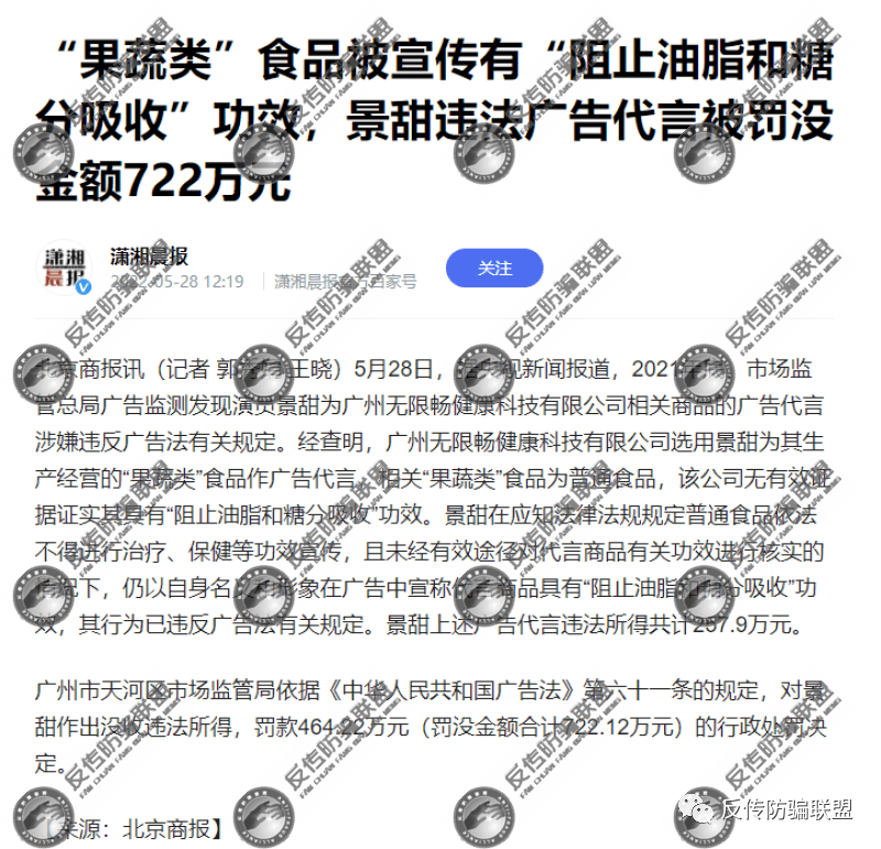 最近期的前车之鉴,就是由景甜为广州无限畅健康科技有限公司相关商品代言的“果蔬类”食品被宣传有“阻止油脂和糖分吸收”功效,因违法广告相关规定被罚没金额722万元。