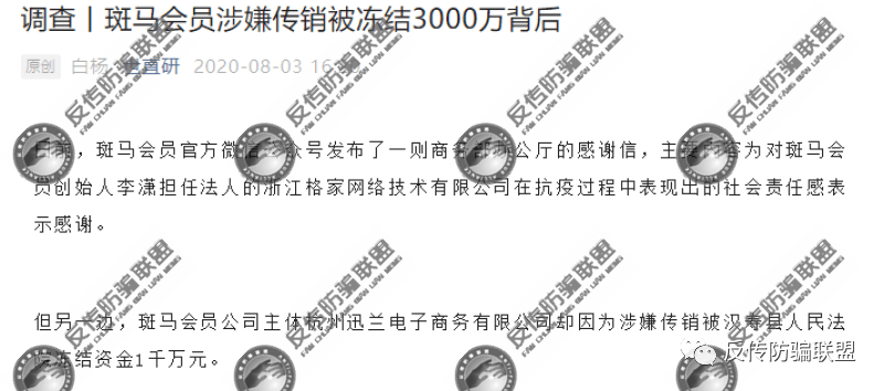 2020年8月,有媒体报道了斑马会员涉嫌传销被冻结3000万的新闻。