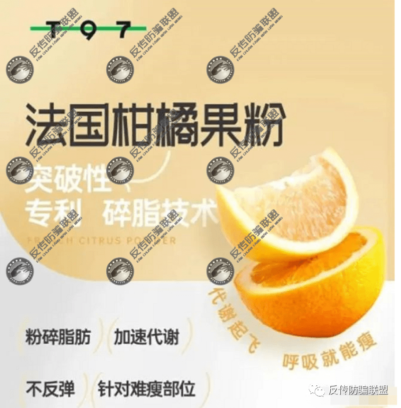 据宣传号推广显示,T97燃脂咖啡含有专利技术提取的法国柑橘果粉能够击碎脂肪,促进脂肪燃烧从而达到高效燃脂的目的,特别有助于击碎腹部、腰部、腿部等难瘦部位脂肪,被称为“碎脂素”。