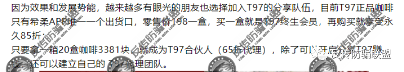 不难看出,T97咖啡以会员认购商品为变相缴纳费用作为加入资格,以发展人员、拉人头的行为为主导,形成上下级,并且以下线的销售业绩为依据计算利润,并且进行团队的市场分红,这不妥妥的又是传销行为了嘛?