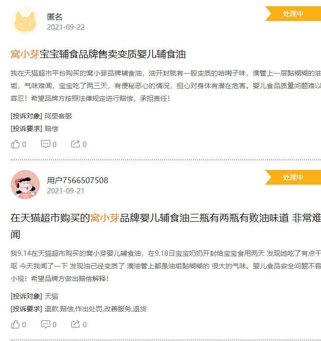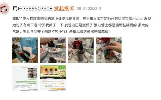 有消费者投诉称,其在电商平台购买的窝小芽品牌辅食油,油开封就有一股变质的哈喇子味,滴管上一层黏糊糊的油垢,气味难闻,宝宝吃了两三天,有便秘恶心的情况。
