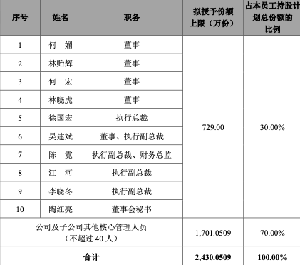 “持股计划”的参与对象不超过50人,其中公司的董高监成员合计10人,获授总份额为不超过729万股,占该计划总份额的比例为30%。