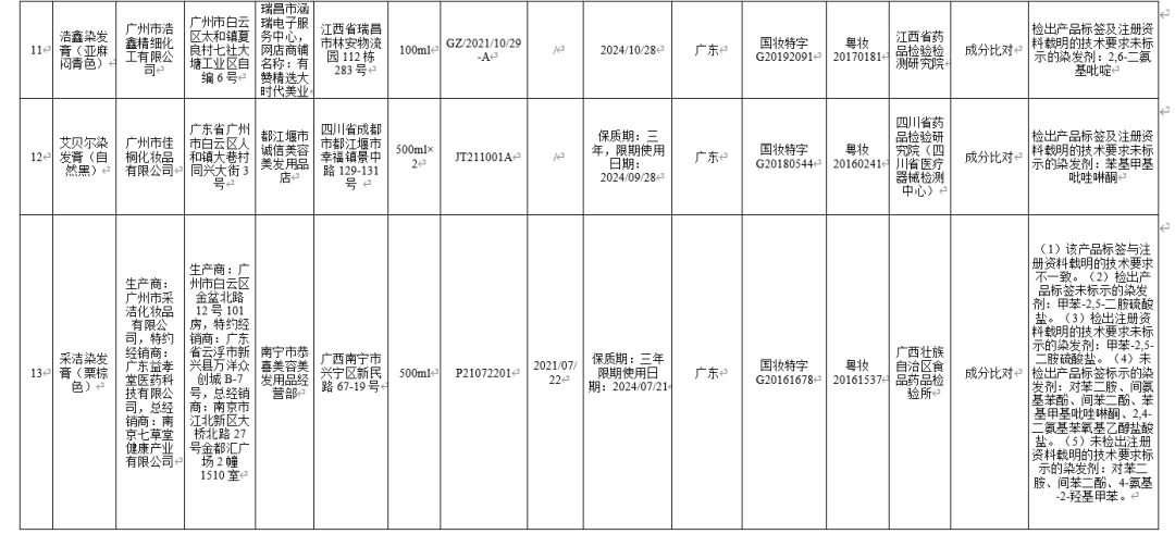 另外,广州市采洁化妆品有限公司生产的采洁染发膏(自然黑、亚麻色、栗子色)被抽检出“产品标签与注册资料载明的技术要求不一致、检出产品标签未标示的染发剂:间苯二酚、苯基甲基吡唑啉酮”等问题。