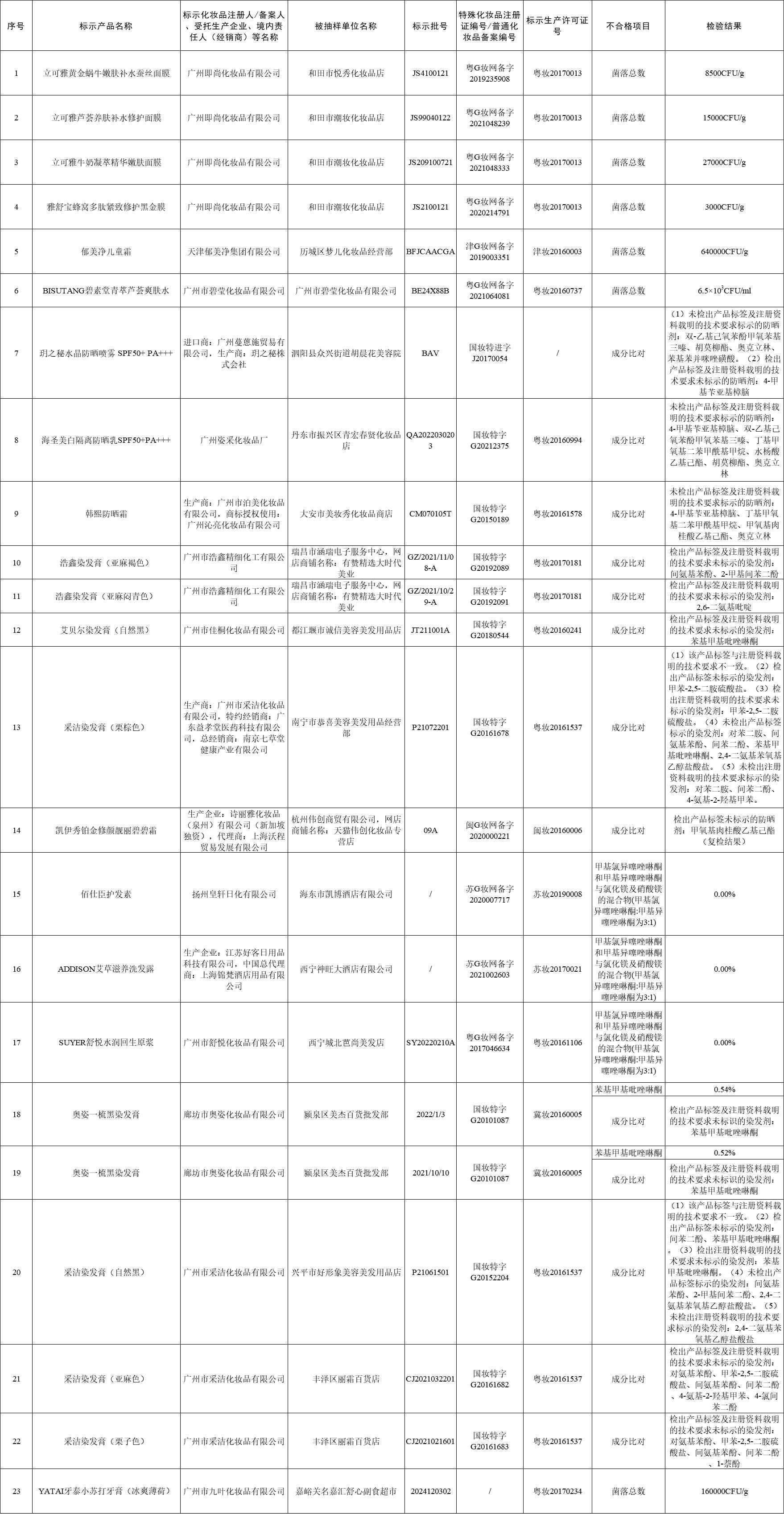 新京报贝壳财经记者注意到,标示为天津郁美净集团有限公司生产的“郁美净儿童霜”1批次产品菌落总数超标;韩熙防晒霜、浩鑫染发膏等13批次产品成分比对不合格;佰仕臣护发素、ADDISON艾草滋养洗发露等5批次产品防腐剂和重金属含量超标。