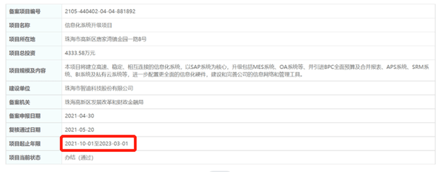 而据广东省投资在线审批监管平台官网,以上三个项目的总投资金额和项目代码与官网相一致,但是项目的建设周期存在差异。官网显示,以上三个项目的项目起止年限均为2021-10-01至2023-03-01,由此可得,上述三个项目的建设周期均为17个月。