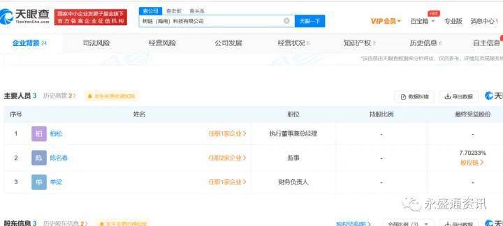 根据十八数藏的官方公众号显示,十八数藏的运营公司为树链(海南)科技有限公司。而据天眼查显示,该公司于2022年6月8日成立,注册资本500万,法定代表人为柏松,股东为梁振文、王平,持股比例分别为51%、49%。