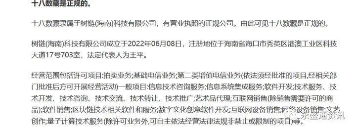 根据永盛通资讯查询,十八数藏隶属于树链(海南)科技有限公司,有营业执照的正规公司。由此可见十八数藏是正规的。