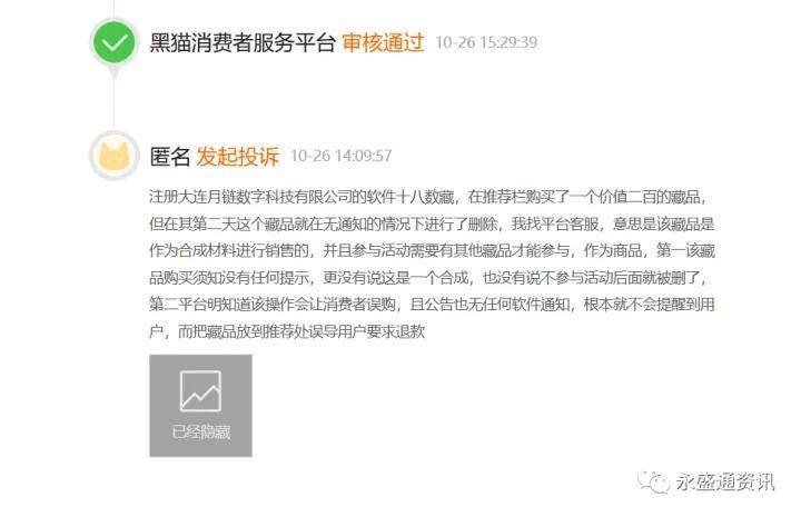 此外,永盛通资讯注意到,数字藏品市场近几个月“降温”,部分平台暂停、停止新藏品发行,甚至还有平台整体关停,上述情况或诱发了用户“维权”。
