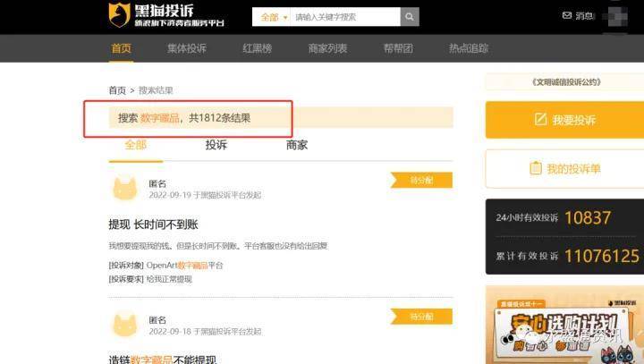 在黑猫投诉平台以“数字藏品”为关键词搜索发现,围绕虚假宣传、商家随意修改规则、强制售出、用户数据安全等方面的投诉已达1812条。