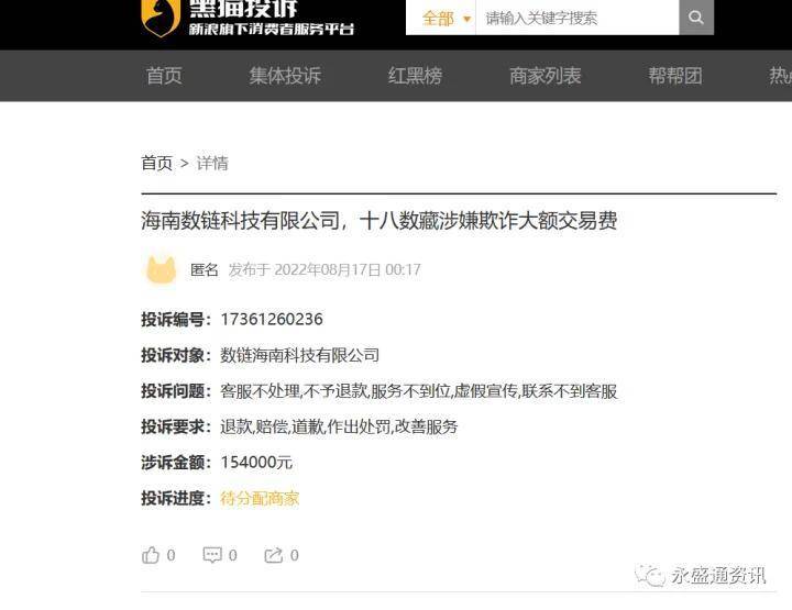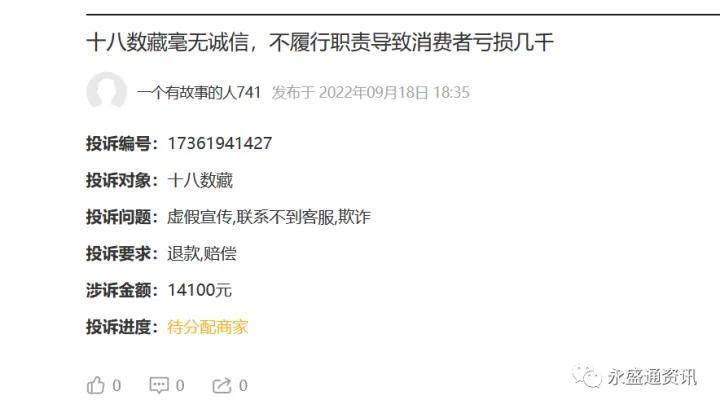 十八数藏可以用劣迹斑斑形容了,面对这么多投诉和维权,树链(海南)科技有限公司将会作何解释,永盛通资讯将持续关注。